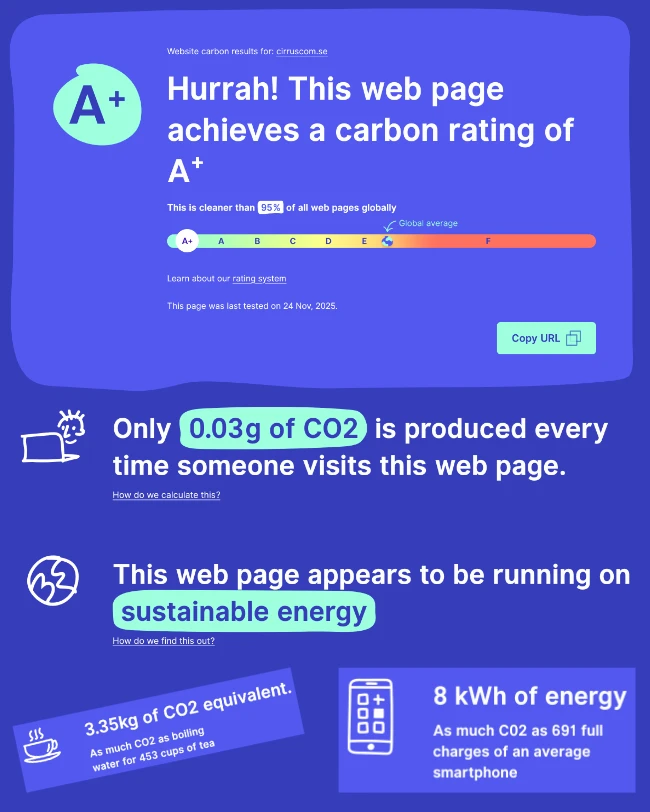 Med en static-first-arkitektur är Cirrus Coms hemsida mer motståndskraftig mot trafiktoppar, mer stabil och enklare att underhålla. Besökare upplever blixtsnabba laddningstider och sidan är robust nog att hantera tusentals besök utan fördröjningar.
